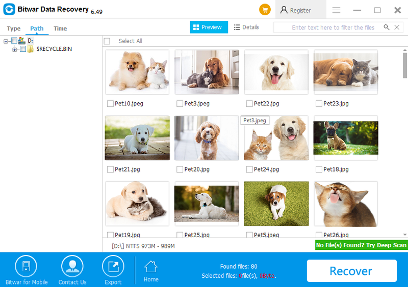 After the scan, you can filter the files by file name, type, path and time. Then double-click the file which you want to preview to make a selective recovery. After determined, click the "Recover" button to save it to another partition or other external device which can be accesse